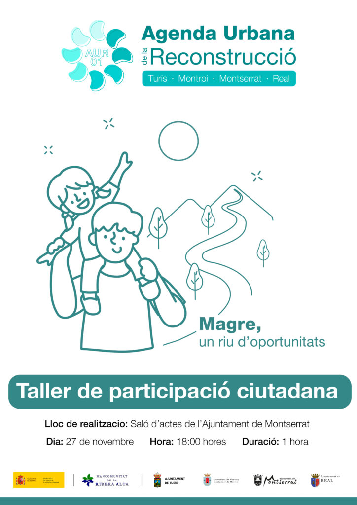 El pròxim dijous 27 de novembre, dins del projecte de desenvolupament de l’Agenda Urbana de la Reconstrucció (AUR) de l’Àrea Funcional 01, es realitzará en el Saló d’actes de l’Ajuntament de Montserrat el taller de participació ciutadana per a recollir les necessitats de la població per a pal·liar els efectes de la DANA del passat any.
