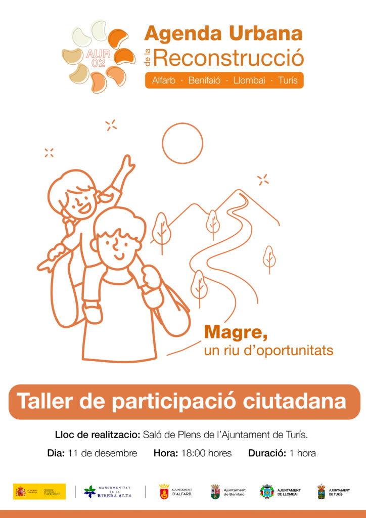 El pròxim dijous 11 de desembre, dins del projecte de desenvolupament de l’Agenda Urbana de la Reconstrucció (AUR) de l’Àrea Funcional 02, es realitzará en el saló de Plens de l’Ajuntament de Turís (Pl. Vicent Ribes nº 1, Turís), el taller de participació ciutadana per a recollir les necessitats de la població per a pal·liar els efectes de la DANA del passat any.